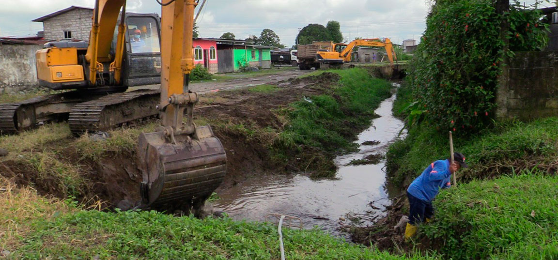 Maquinaria Municipal realiza desde la semana anterior la limpieza de los esteros que dentro del Cantón representan riesgos durante la época invernal, la fuerte lluvia registrada el pasado miércoles 14 de abril, requirió que se realicen nuevos trabajos de evacuación de lodo y basura, sedimentos que ocasionan que tanto esteros como alcantarillas se tapen y se desborden perjudicando a las casas vecinas.